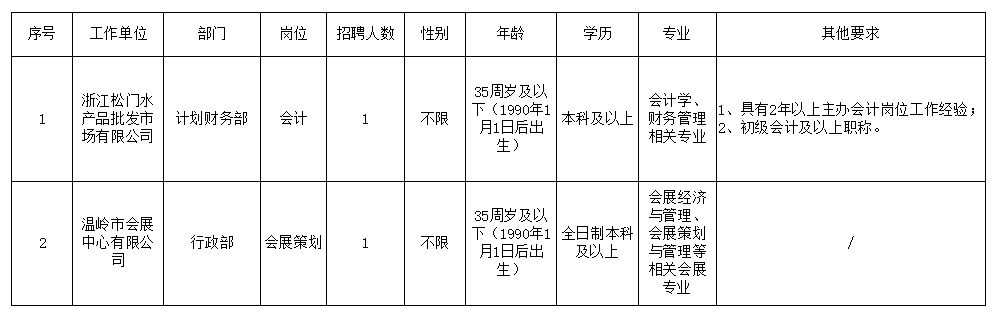 因业务发展需要,浙江岭食商贸有限公司现面向社会公开招聘工作人员3名,具体事项公告如下:一、招聘岗位、人数及要求接录单:2人仓管:1人,要求:男性(夜班),年龄原则上不超过40周岁,熟练操作电脑,有国企