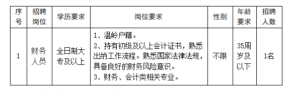 温岭市海馨物业管理有限公司成立于2024年6月,为温岭市海城投资集团有限公司(国有企业)下属全资子公司,主要经营物业管理、酒店管理等业务。因工作需要,现面向社会公开招聘财务人员1名。具体事项公告如下: